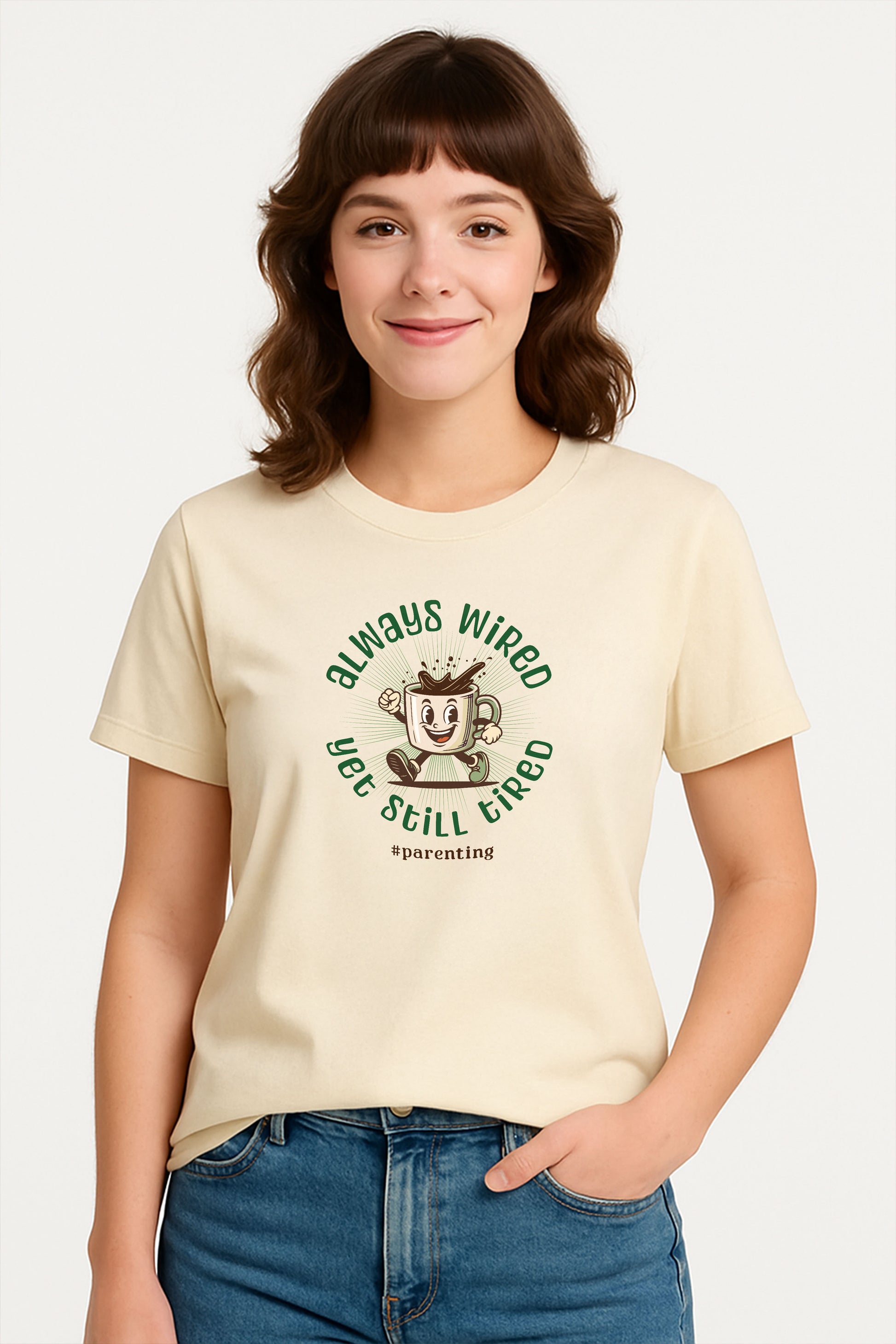 Millennial parenting is a full-time juggling act—work, kids, endless errands, and somehow trying to keep your sanity intact. No matter how many cups of coffee you slam down, exhaustion still wins. That’s the joke behind this retro-inspired graphic tee featuring the witty phrase: “Always Wired, Yet Still Tired #Parenting.”